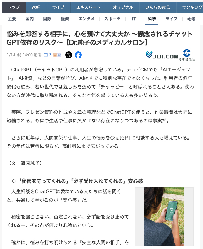 悩みを即答する相手に、心を預けて大丈夫か ~懸念されるチャットGPT依存のリスク~【Dr.純子のメディカルサロン】