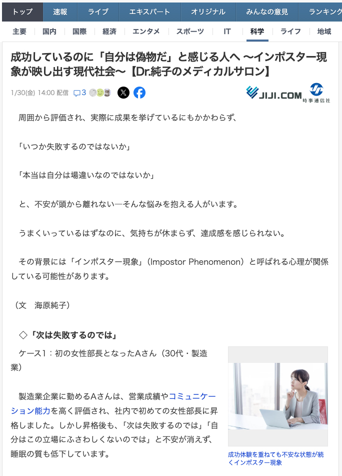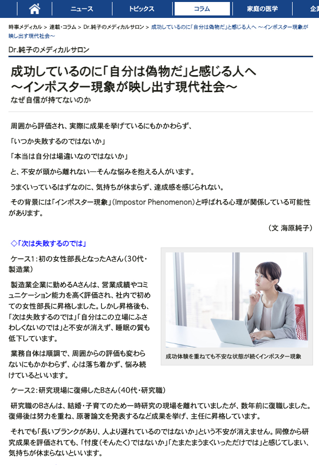 成功しているのに「自分は偽物だ」と感じる人へ ~インポスター現象が映し出す現代社会~【Dr.純子のメディカルサロン】